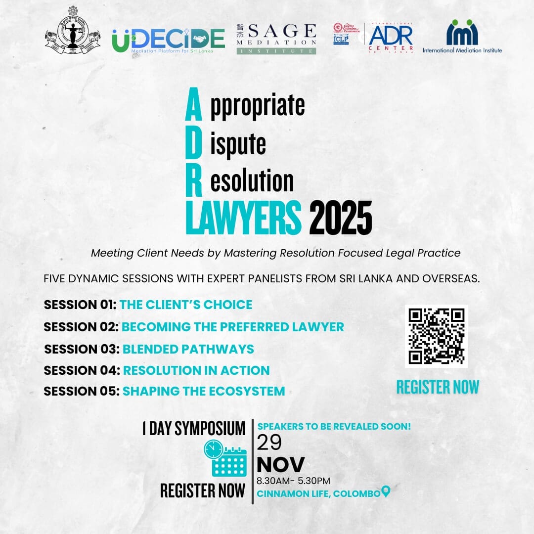 Sri Lanka’s legal profession is entering a transformative era – one that values collaboration, communication, and constructive resolution over confrontation. On 29 November 2025 in Colombo, Sri Lanka, UDecide Mediation (Sri Lanka) and Sage Mediation (Singapore), in partnership with the Bar Association of Sri Lanka (BASL), the International Alternative Dispute Resolution Center (IADRC), and with institutional support of the International Mediation Institute (IMI), will host ADR Lawyers 2025, a one-day symposium designed to equip lawyers with the tools and insight needed to thrive in a resolution-focused future.